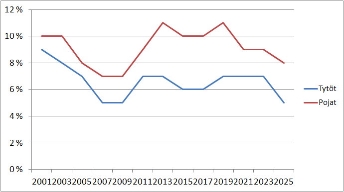 Kokeillut laittomia huumeita ainakin kerran (peruskoulun 8. ja 9. luokka)