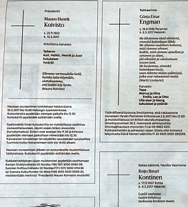Kuvassa on presidentti Mauno Koiviston kuolinilmoitus, joka julkaistiin Helsingin Sanomissa
