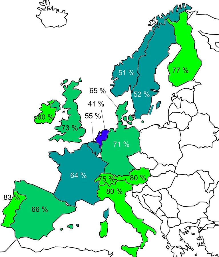 Länsi-Euroopassa itseään kristittyinä pitävät maittain